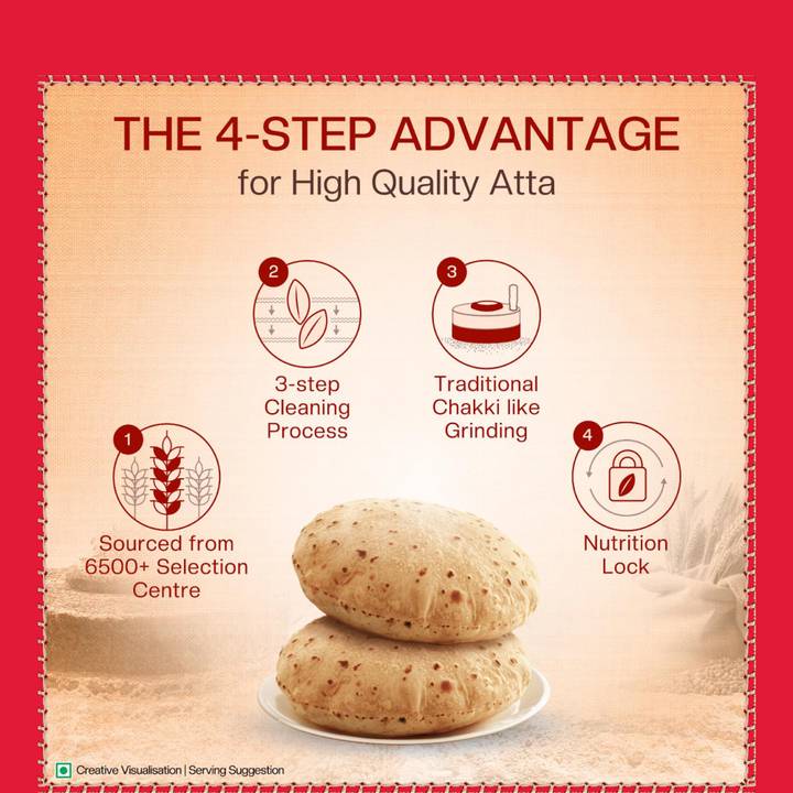 Aashirvaad Shudh Chakki Atta uses the 4-step advantage process of sourcing, cleaning, grinding & contactless packaging. Wheat is sourced from 6500+ selection centers across India. The grains are cleaned thrice. Chakki-grinding ensures it contains 0% Maida & 100% Sampoorna Atta. The mechanised packaging ensures it is untouched & hygienic.